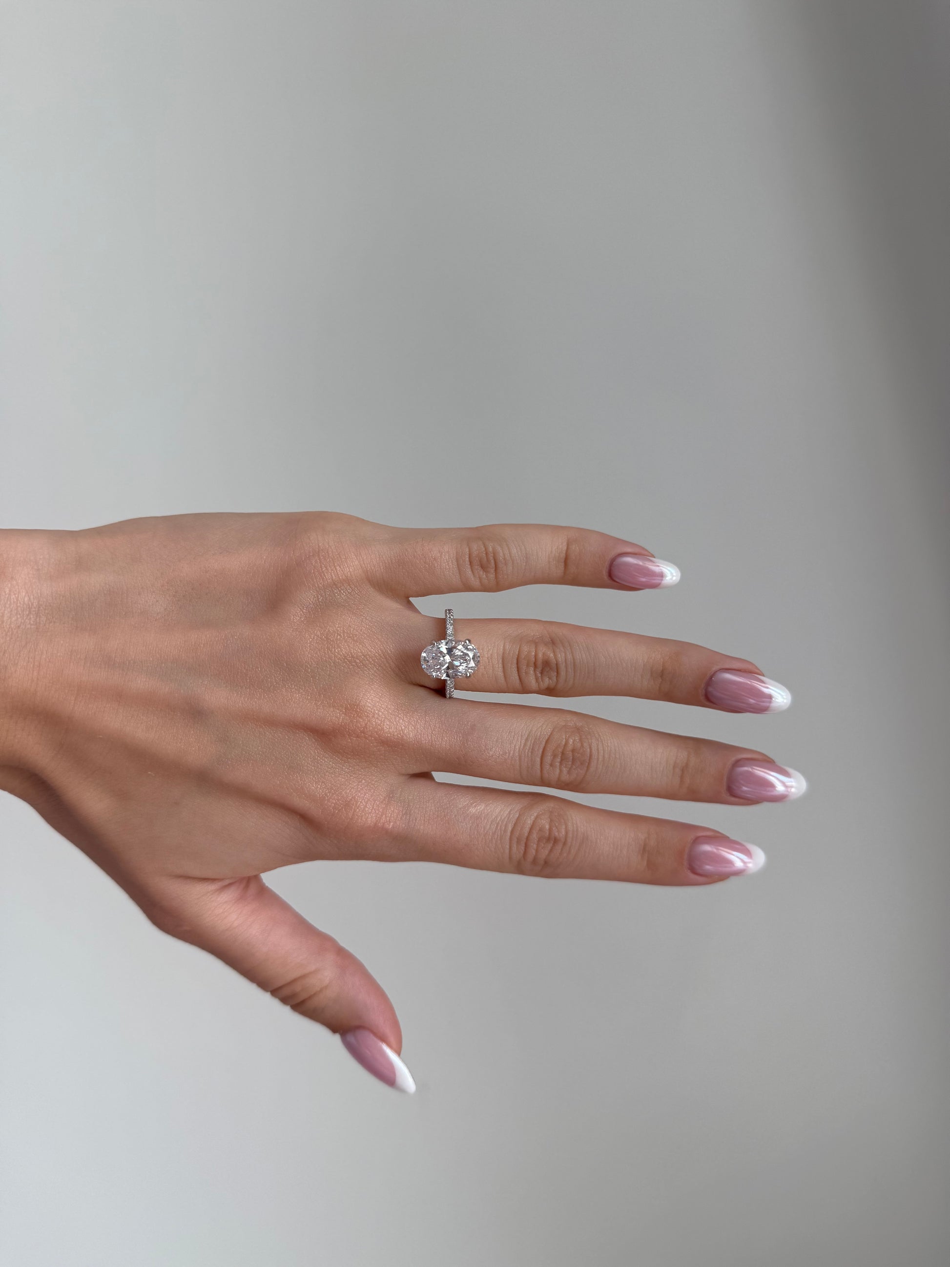 With a striking oval-cut diamond at its center and smaller diamonds along the band, it catches the light from every angle. The balance of a bold centerpiece with subtle side sparkle makes it effortlessly iconic.